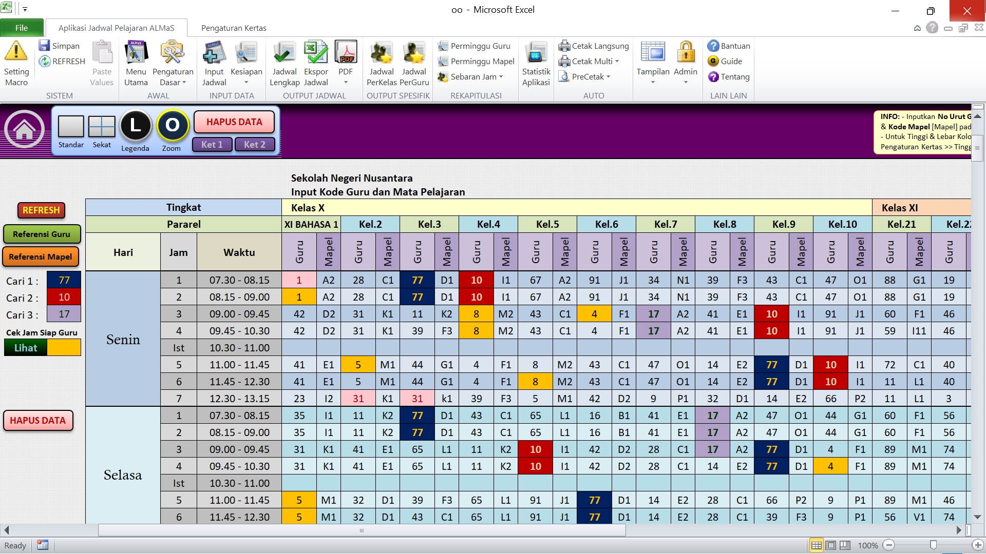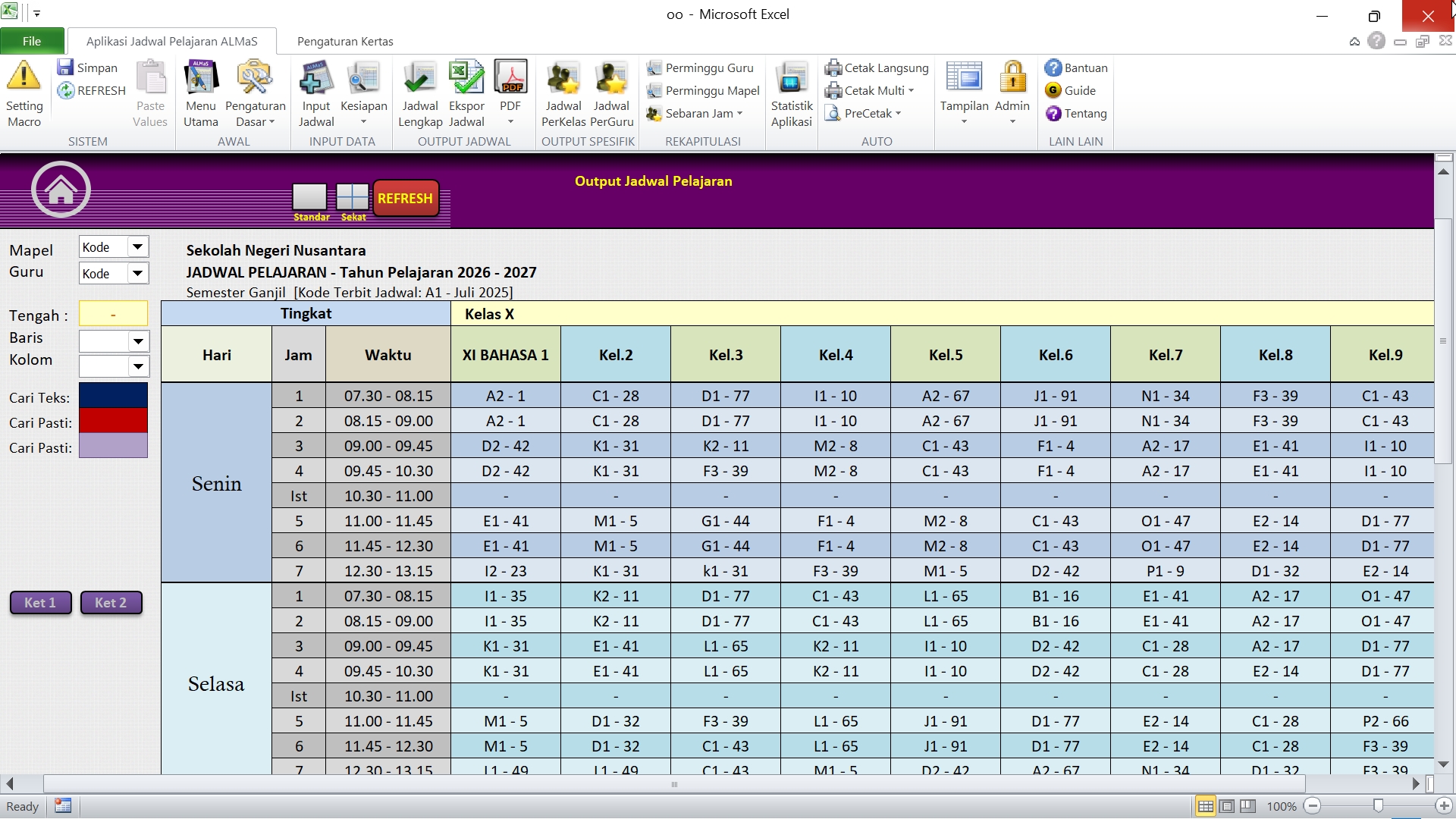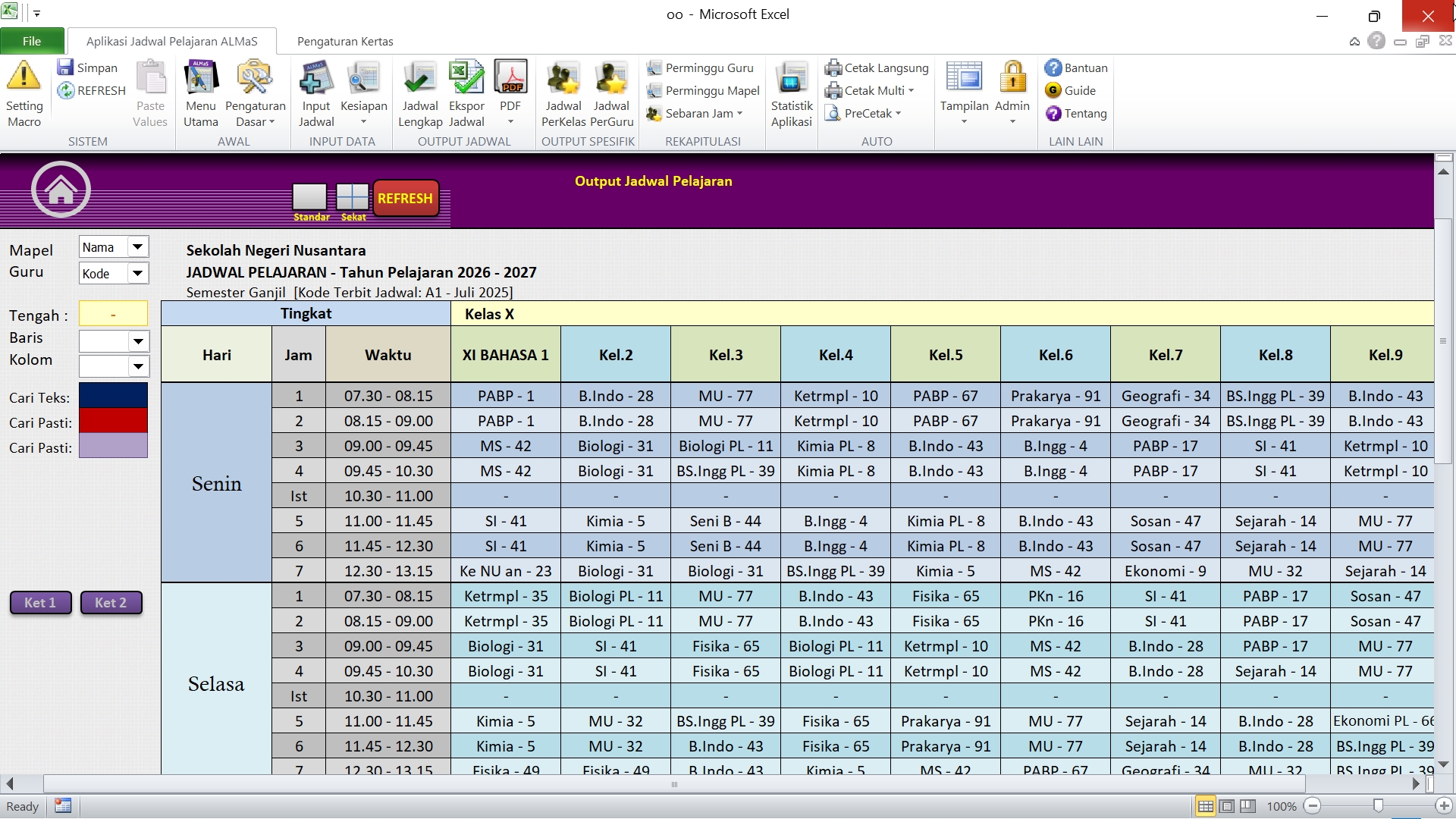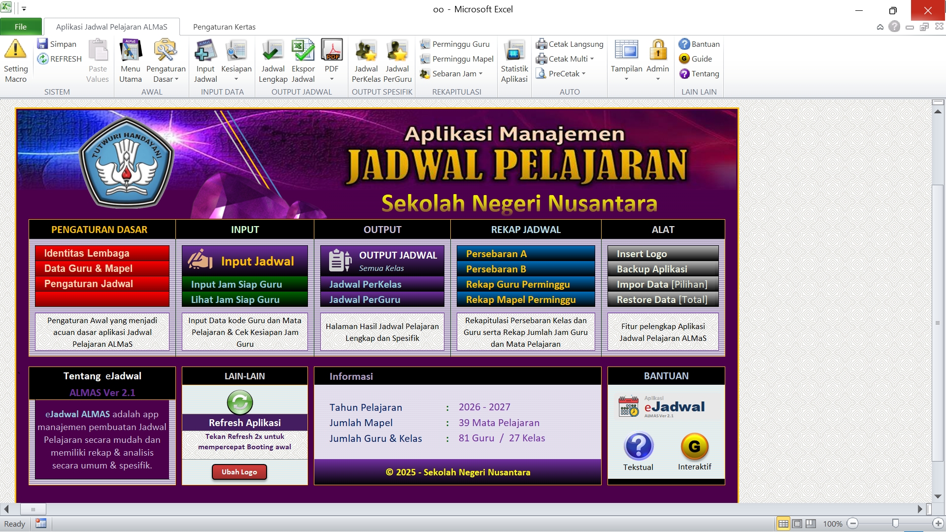 Aplikasi ini tidak memerlukan instalasi khusus, dapat digunakan langsung dari file Excel, dan dilengkapi berbagai fitur yang mempermudah pengaturan jadwal, mulai dari analisis jam mengajar guru, pencarian guru atau kelas, hingga rekap jumlah jam pelajaran per minggu. Dengan eJadwal ALMAS, sekolah dapat menghasilkan jadwal pelajaran yang akurat, rapi, dan siap cetak dengan lebih cepat.