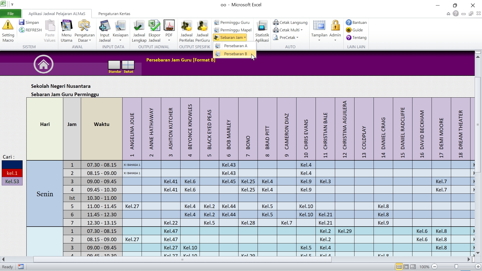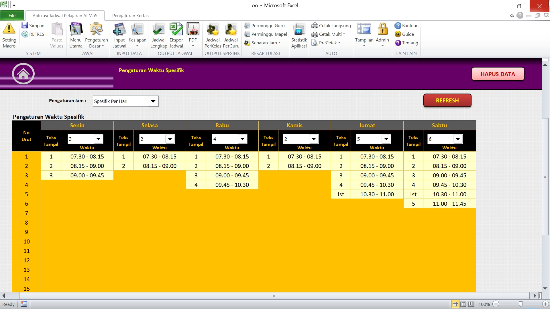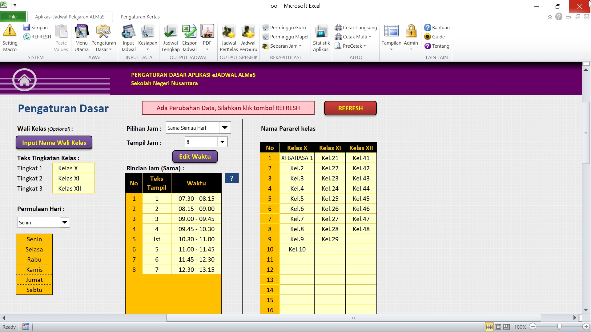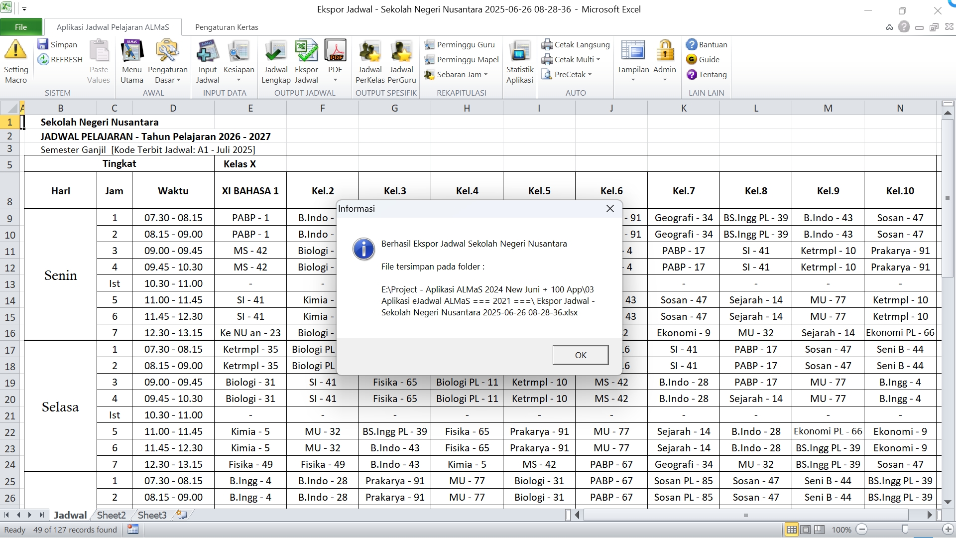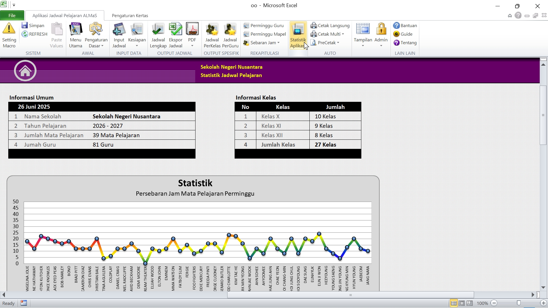 Aplikasi ini tidak memerlukan instalasi khusus, dapat digunakan langsung dari file Excel, dan dilengkapi berbagai fitur yang mempermudah pengaturan jadwal, mulai dari analisis jam mengajar guru, pencarian guru atau kelas, hingga rekap jumlah jam pelajaran per minggu. Dengan eJadwal ALMAS, sekolah dapat menghasilkan jadwal pelajaran yang akurat, rapi, dan siap cetak dengan lebih cepat.