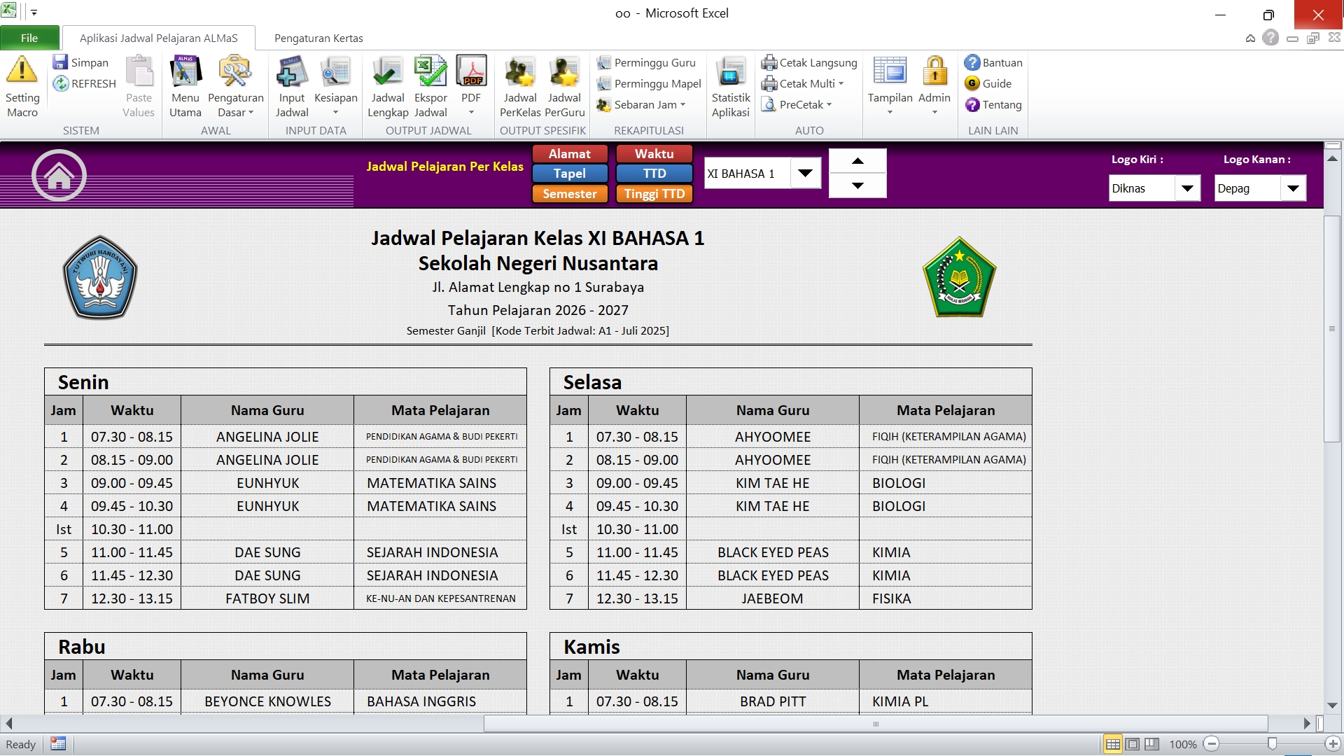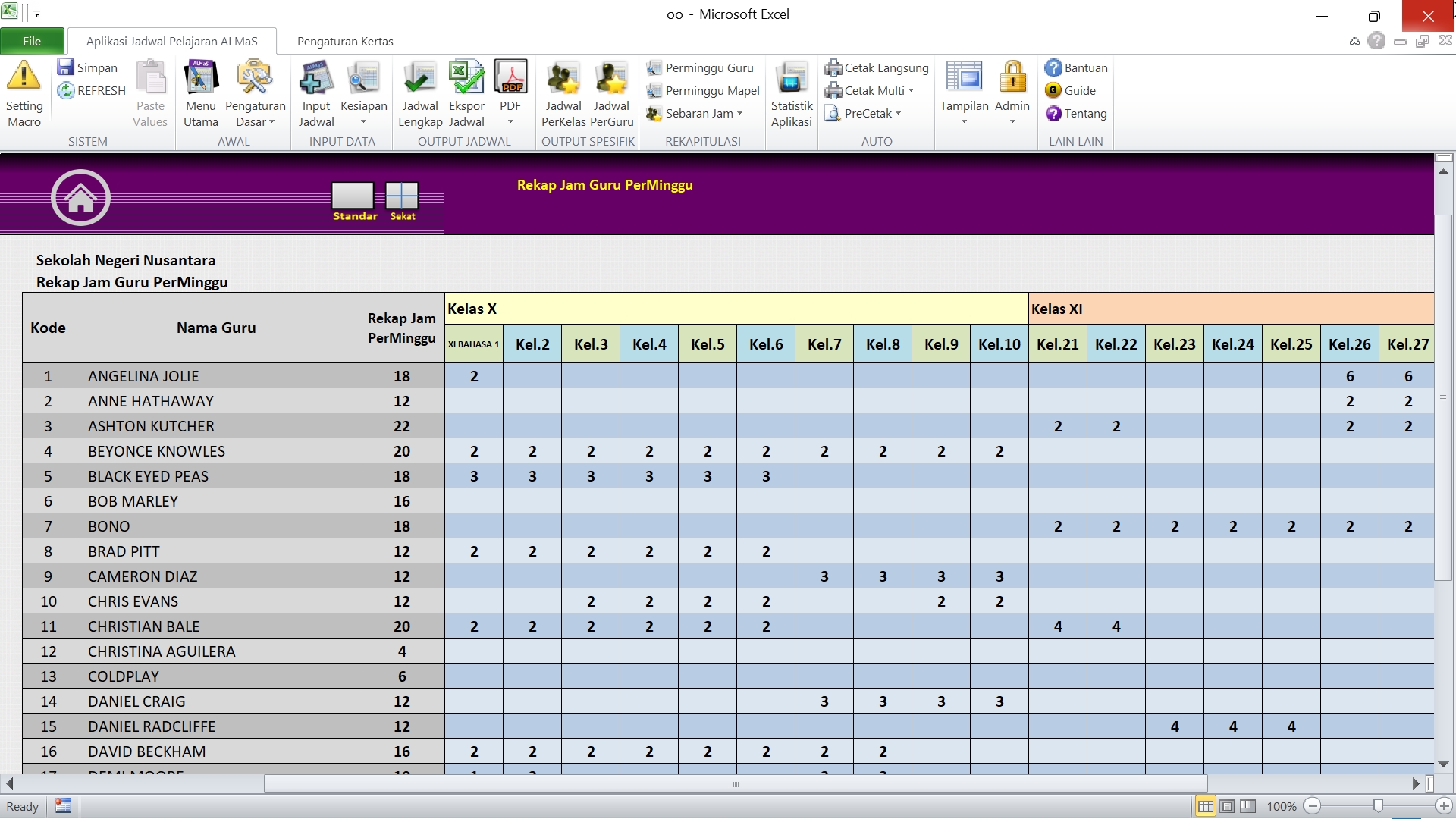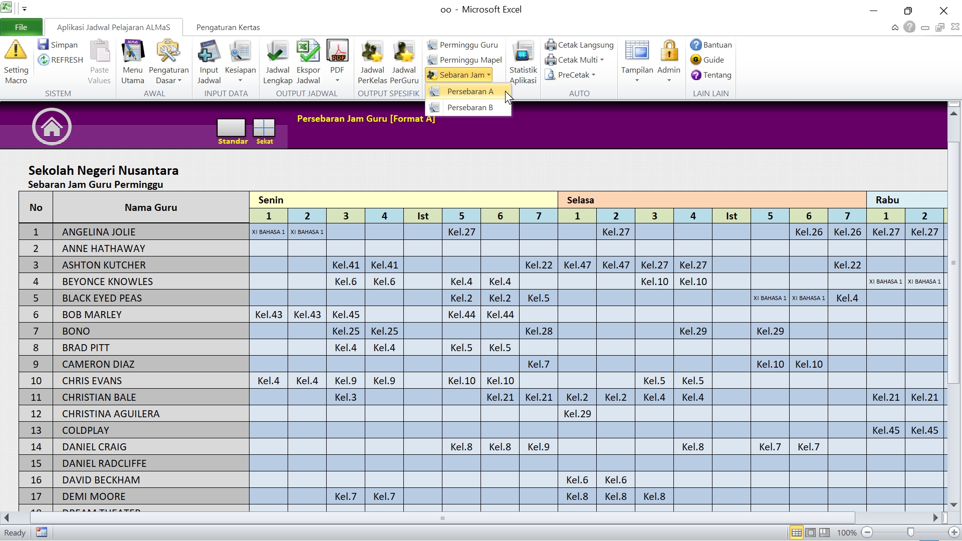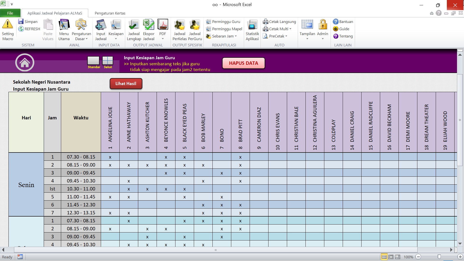 Aplikasi ini tidak memerlukan instalasi khusus, dapat digunakan langsung dari file Excel, dan dilengkapi berbagai fitur yang mempermudah pengaturan jadwal, mulai dari analisis jam mengajar guru, pencarian guru atau kelas, hingga rekap jumlah jam pelajaran per minggu. Dengan eJadwal ALMAS, sekolah dapat menghasilkan jadwal pelajaran yang akurat, rapi, dan siap cetak dengan lebih cepat.