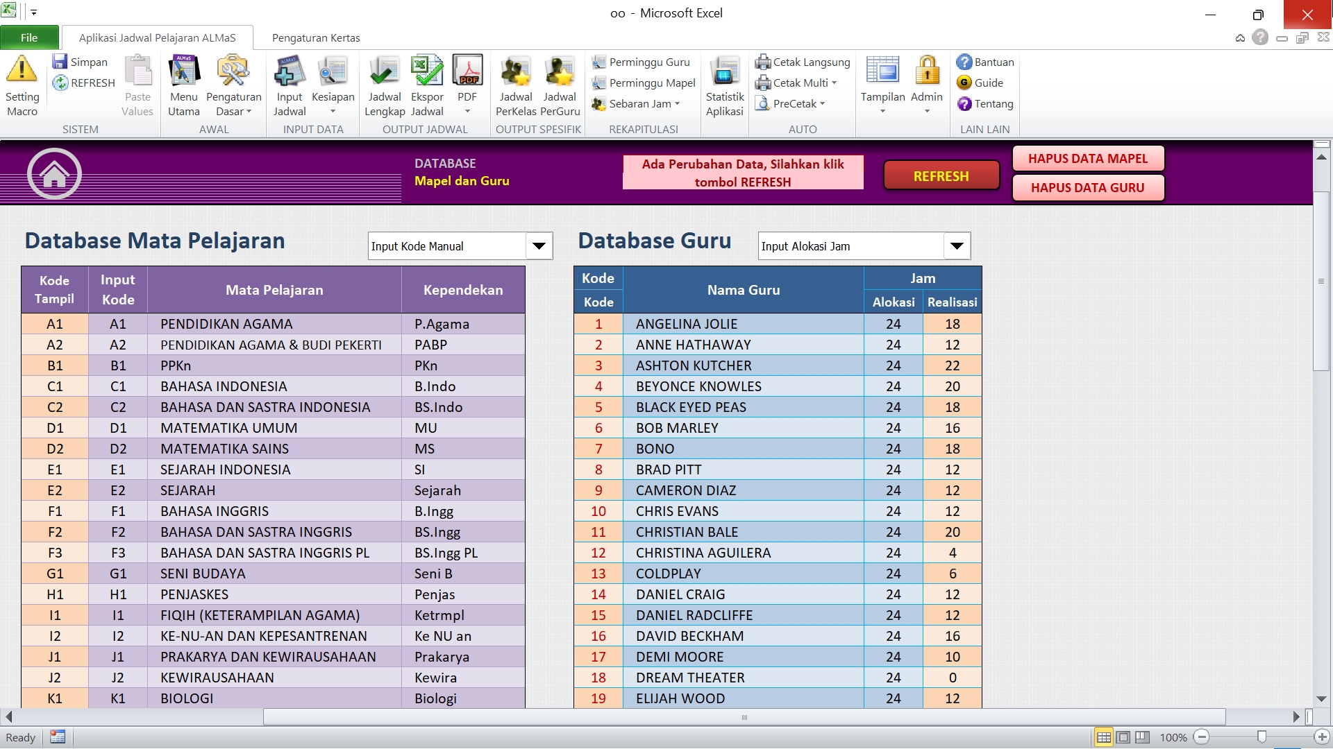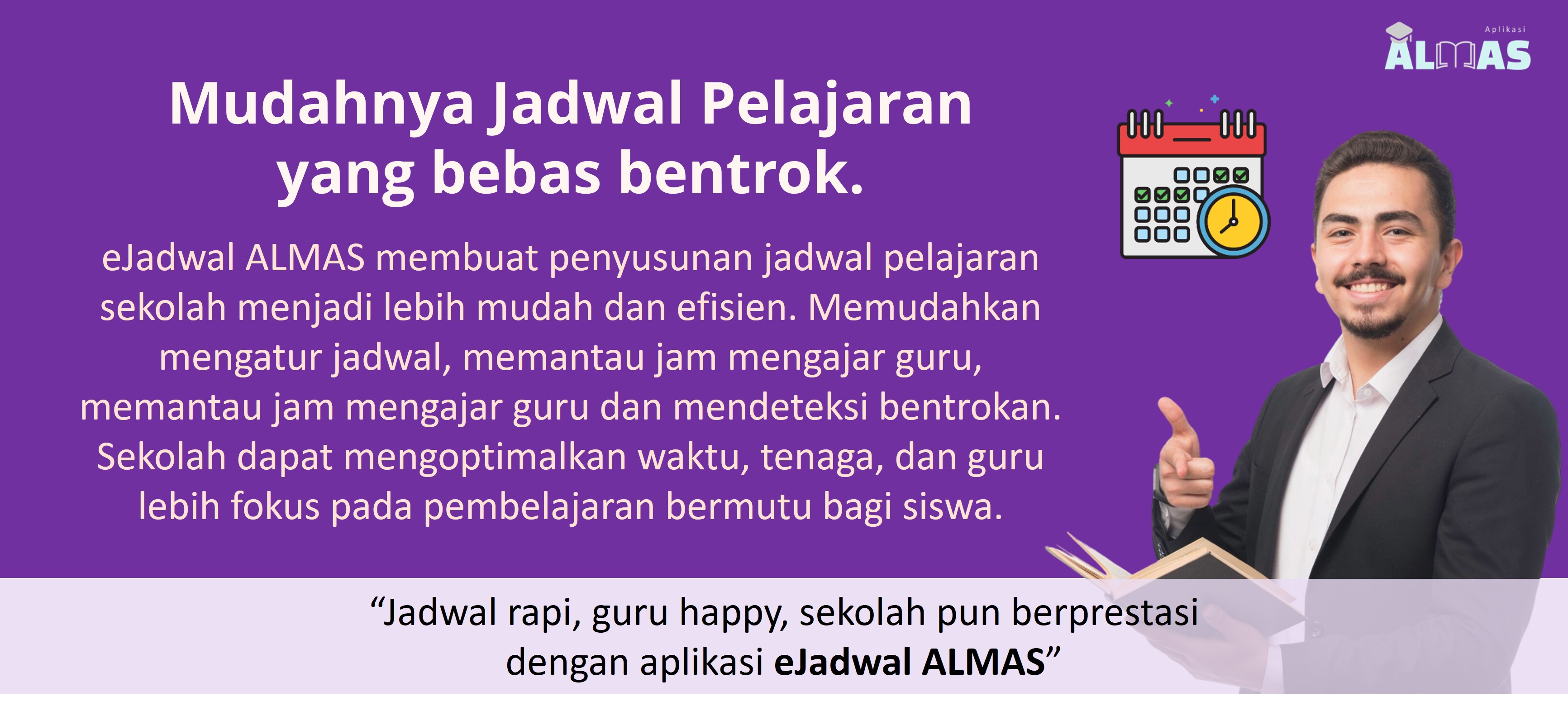 eJadwal ALMAS adalah sebuah aplikasi jadwal pelajaran berbasis Microsoft Excel yang dirancang khusus untuk membantu sekolah dalam membuat dan mengelola jadwal pelajaran dengan mudah, cepat, dan efisien. Aplikasi ini membantu kurikulum, wakil kepala sekolah, maupun tenaga tata usaha untuk menyusun jadwal hingga puluhan jam pelajaran dan puluhan kelas dengan mudah, dengan sistem pemeriksaan bentrokan jadwal yang andal.