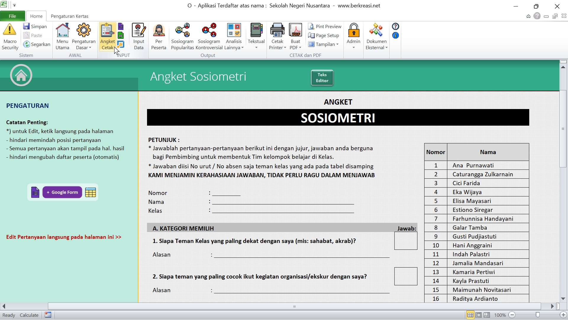 Formulir Pemilihan Siswa: Siswa diminta menjawab pertanyaan seperti “Siapa teman yang paling dekat?”, “Siapa yang paling sering kamu ajak kerja kelompok?”, hingga “Siapa yang paling kamu hindari?”.
