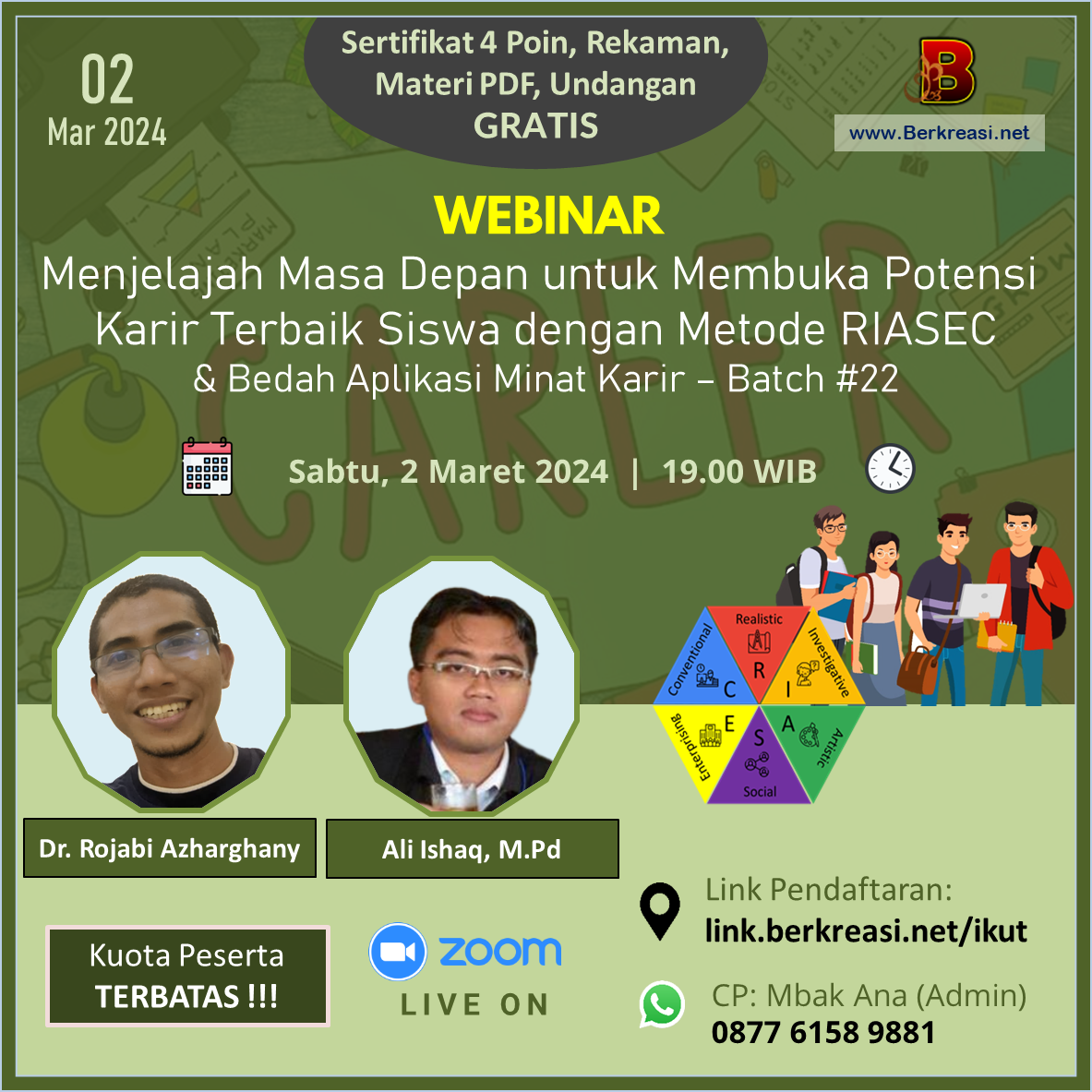 Bagaimana merancang kesuksesan dalam karier siswa? Ikuti Webinar ini yang akan membawa perubahan positif mengungkap potensi karir dengan metode RIASEC yang keren!