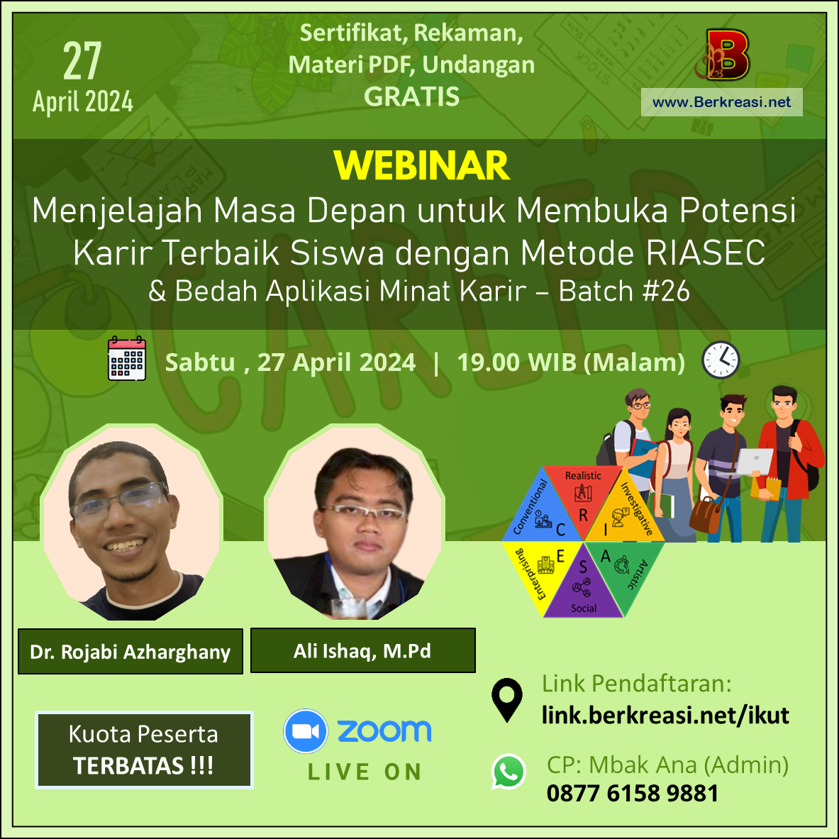 Bagaimana merancang kesuksesan dalam karier siswa? Ikuti Webinar ini yang akan membawa perubahan positif mengungkap potensi karir dengan metode RIASEC yang keren!