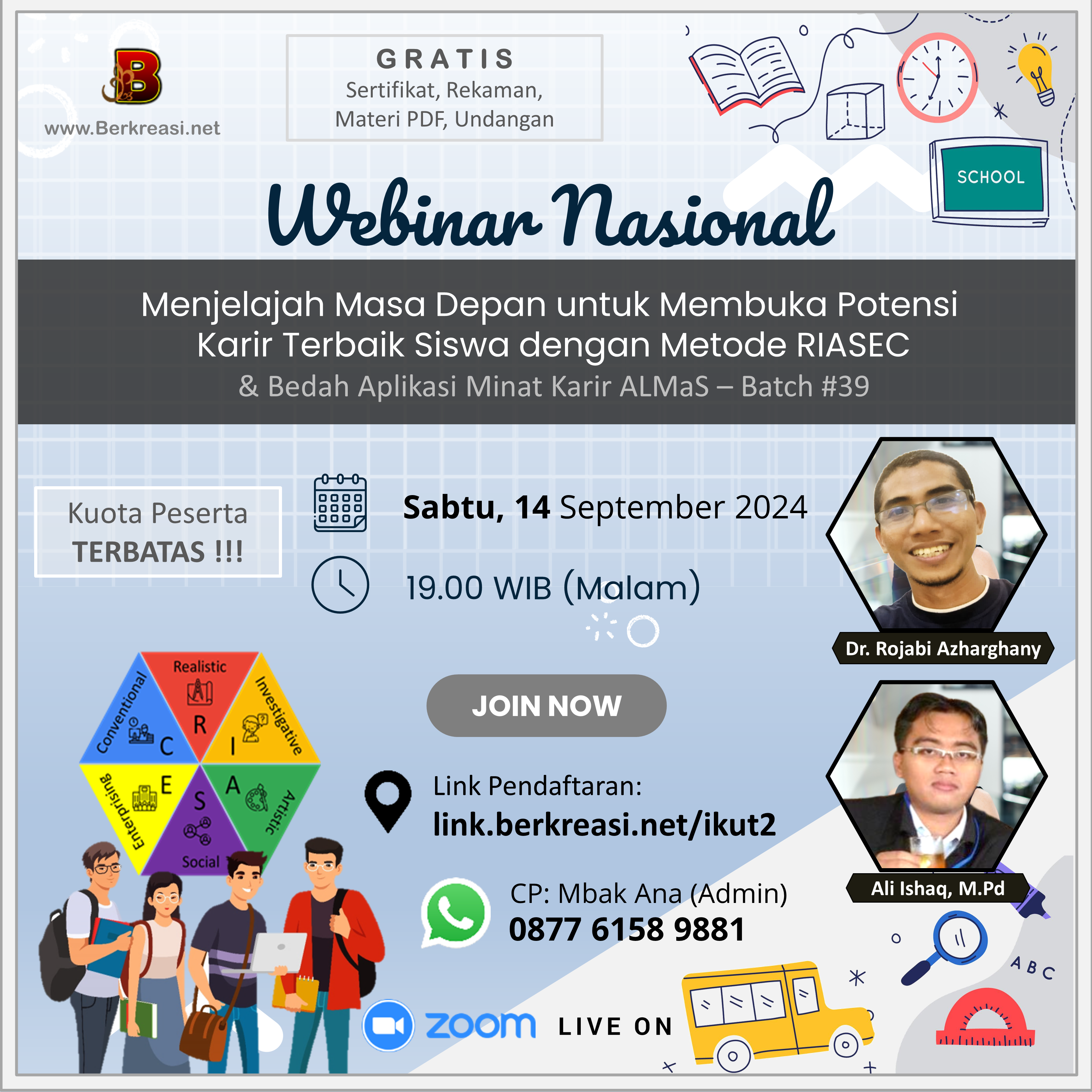 Bagaimana merancang kesuksesan dalam karier siswa? Ikuti Webinar ini yang akan membawa perubahan positif mengungkap potensi karir dengan metode RIASEC yang keren!