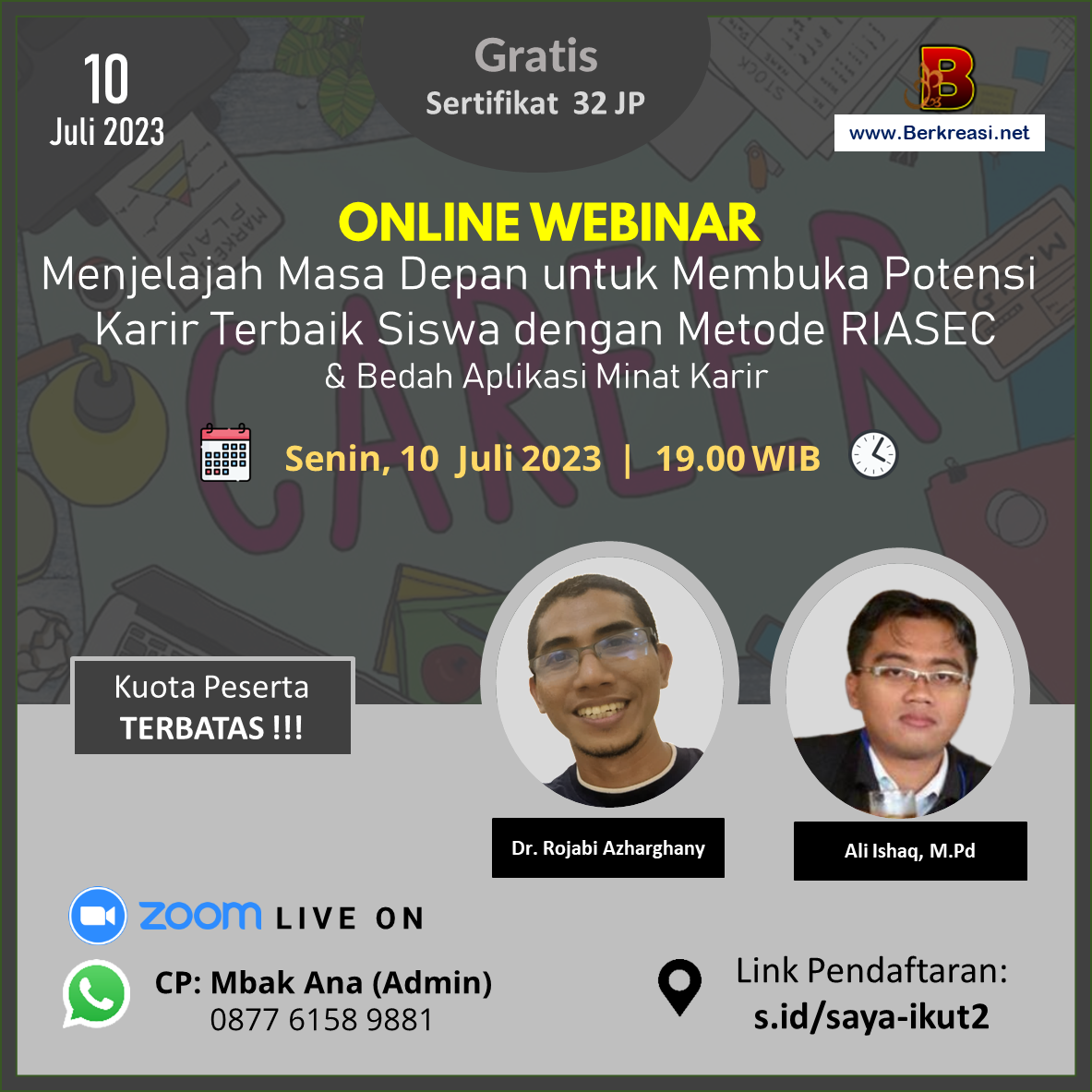 Ingin meraih kesuksesan dalam karier dan hidup siswa kita? Ayo ikuti Webinar Khusus kami yang akan membawa perubahan positif! Bergabunglah dengan teman sejawat untuk mengungkap potensi karir dengan metode RIASEC yang keren!