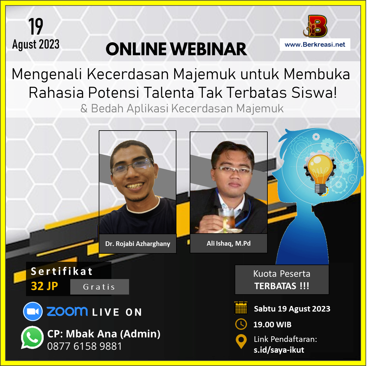 Mengoptimalkan potensi diri siswa dan mencapai kesuksesan yang gemilang dengan mengetahui rahasia kecerdasan terbaik? Kesempatan langka untuk bergabung dalam webinar inspiratif Mengenali Kecerdasan Majemuk!